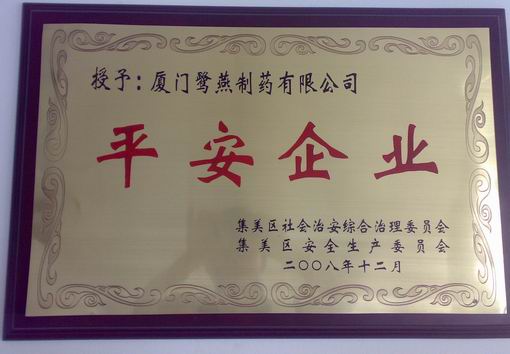 近日,集美區(qū)召開了“2008年度平安企業(yè)”表彰大會(huì),廈門鷺燕制藥有限公司從幾百家參評(píng)企業(yè)中脫穎而出,獲此殊榮。
