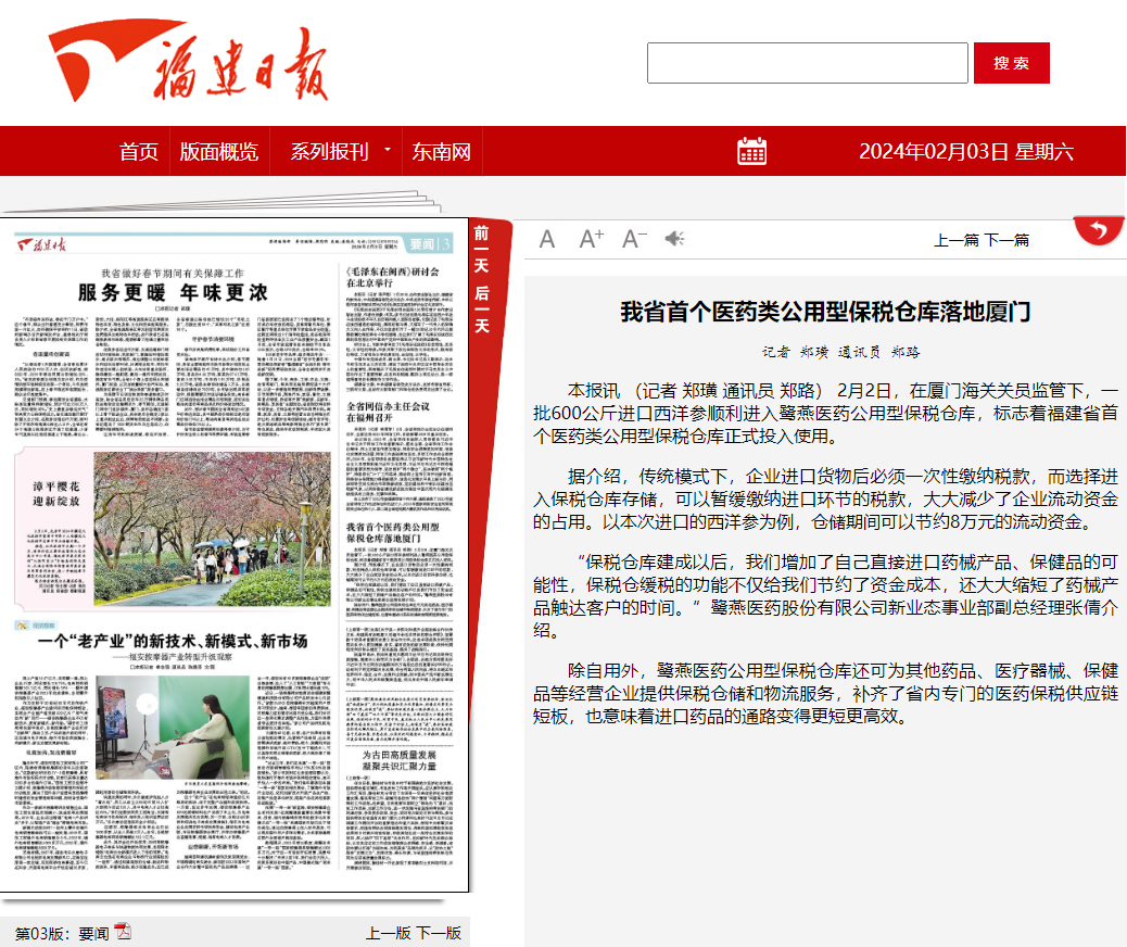 2024年2月2日,鷺燕醫(yī)藥公用型保稅倉獲批投用,《福建日報》《廈門日報》相繼報道相關(guān)新聞。鷺燕醫(yī)藥公用型保稅倉是福建省首個醫(yī)藥類公用型保稅倉庫,該保稅倉庫的投用,意味著廈門市乃至福建省補齊了區(qū)域內(nèi)專門的醫(yī)藥保稅供應(yīng)鏈物流服務(wù),也意味著廈門和福建進口藥品的通路變得更短,更為高效。