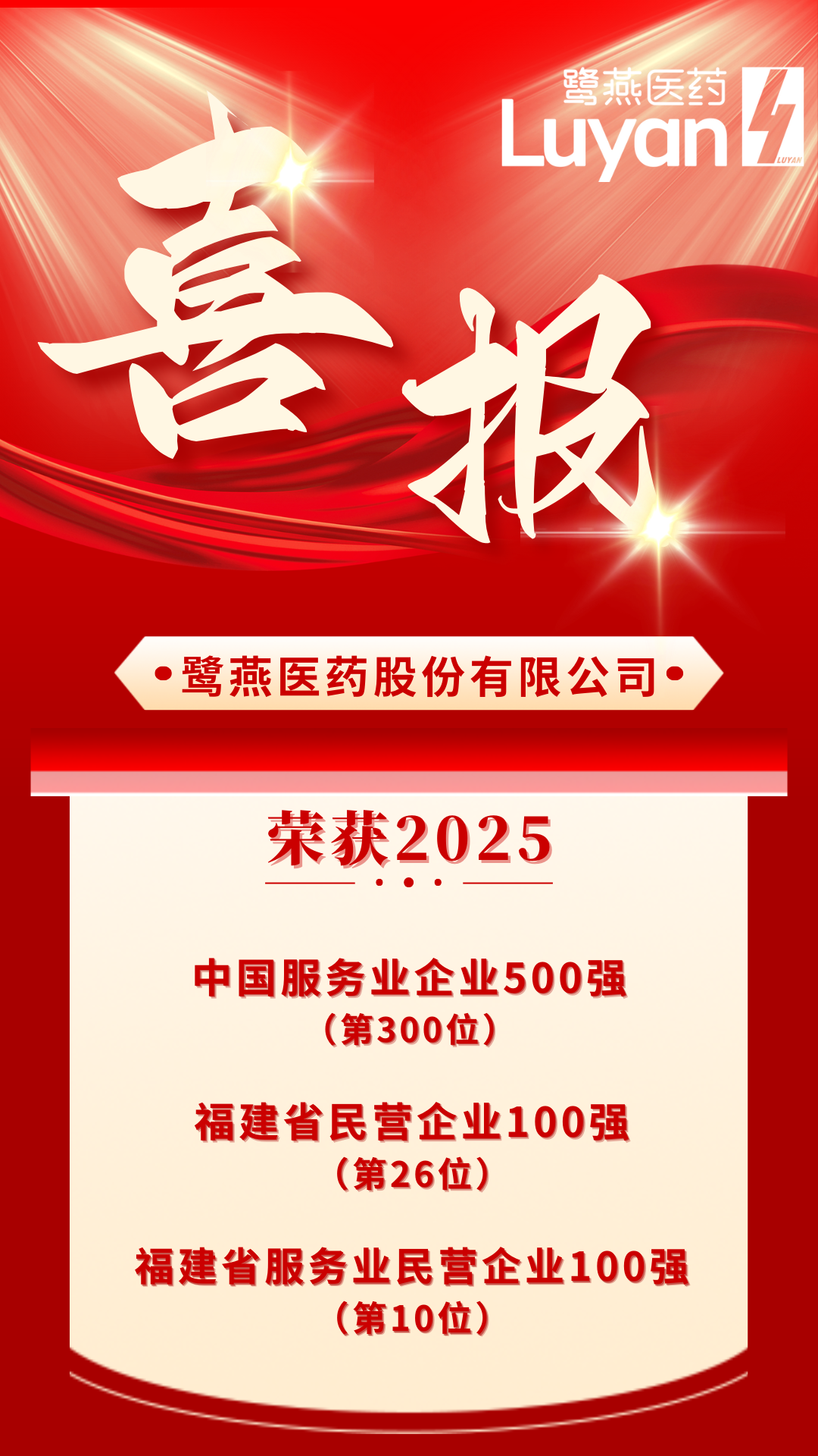 9月28日,福建省工商業(yè)聯(lián)合會(huì)在寧德發(fā)布“2025福建民營(yíng)企業(yè)100強(qiáng)”,鷺燕醫(yī)藥連續(xù)5年上榜,列第26位。同時(shí),在“2025福建省服務(wù)業(yè)民營(yíng)企業(yè)100強(qiáng)”榜單上,鷺燕醫(yī)藥連續(xù)3年上榜,位居第10位。