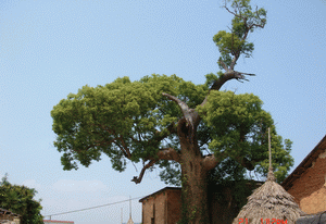(藍(lán)天,白云,古樹,房屋一幅和諧美麗的“圖畫”)